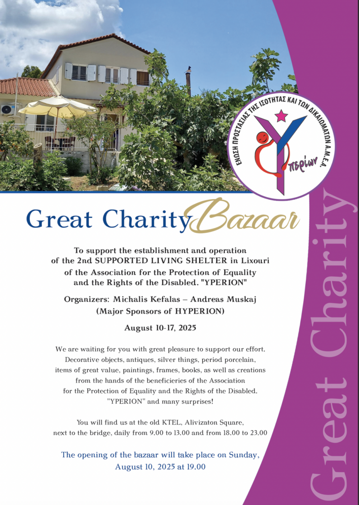 Την Κυριακή 10 Αυγούστου στις 19.00, θα πραγματοποιηθούν τα εγκαίνια ενός Μεγάλου Bazaar, με σκοπό τα έσοδα της δράσης αυτής να διατεθούν για την Ενίσχυση της Ίδρυσης – Λειτουργίας 2ης ΣΤΕΓΗΣ ΥΠΟΣΤΗΡΙΖΟΜΕΝΗΣ ΔΙΑΒΙΩΣΗΣ, που φιλοδοξεί η Ένωση Προστασίας της Ισότητας και των Δικαιωμάτων Α.μεΑ. «ΥΠΕΡΙΩΝ» να υλοποιήσει στο Ληξούρι.